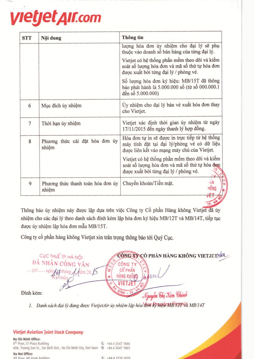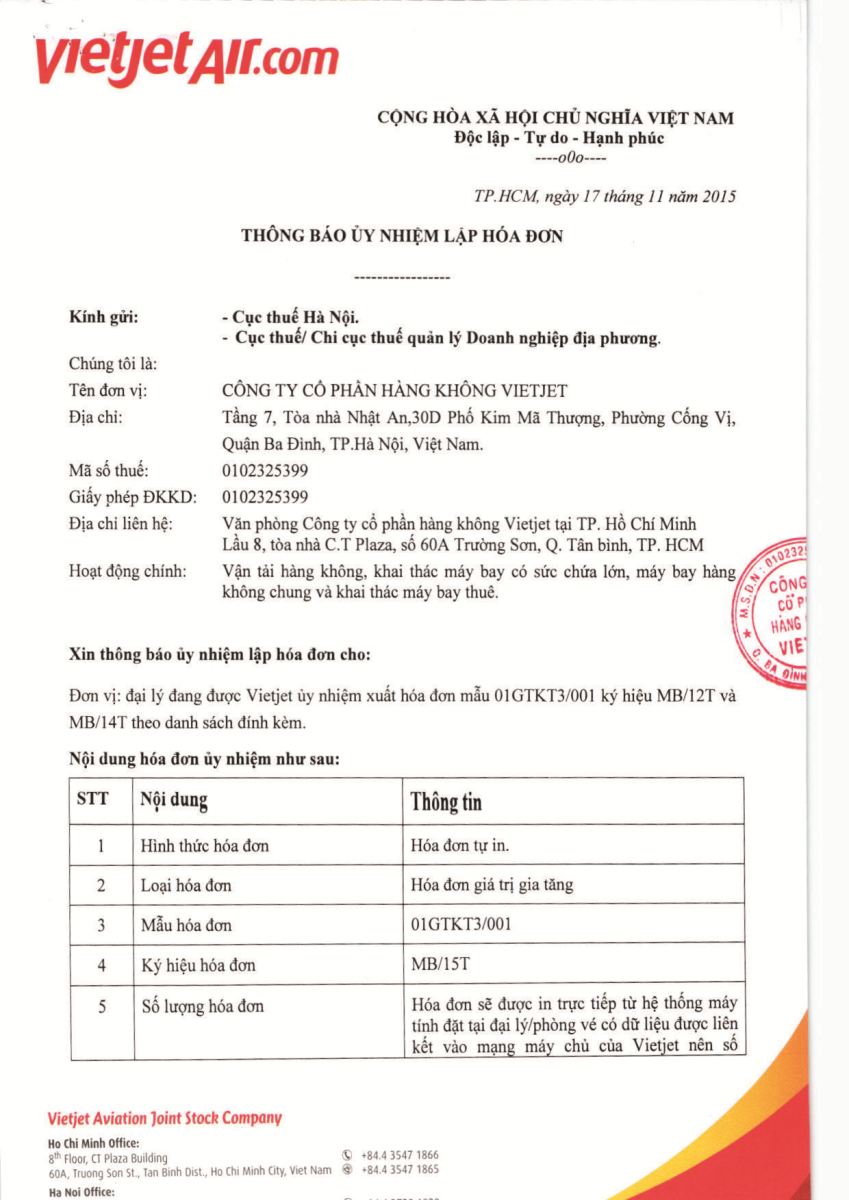 Vietjet Air xin thông báo kể từ ngày 25/11/2015, tất cả đại lý đang được ủy nhiệm xuất hóa đơn ký hiệu MB/12T và MB/14T vẫn sẽ tiếp tục được xuất hóa đơn với ký hiệu mới MB/15T.
